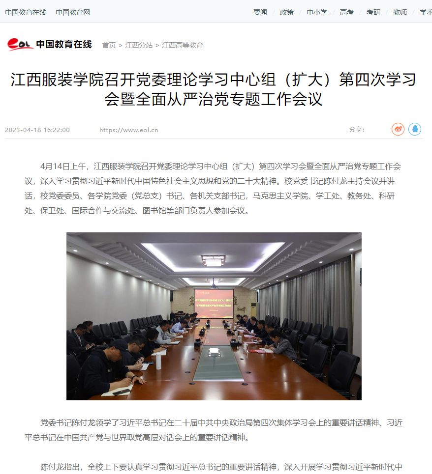 4月14日上午,江西服装学院召开党委理论学习中心组(扩大)第四次学习会暨全面从严治党专题工作会议,深入学习贯彻习近平新时代中国特色社会主义思想和党的二十大精神。校党委书记陈付龙主持会议并讲话,校党委委员、各学院党委(党总支)书记、各机关支部书记,马克思主义学院、学工处、教务处、科研处、保卫处、国际合作与交流处、图书馆等部门负责人参加会议。
