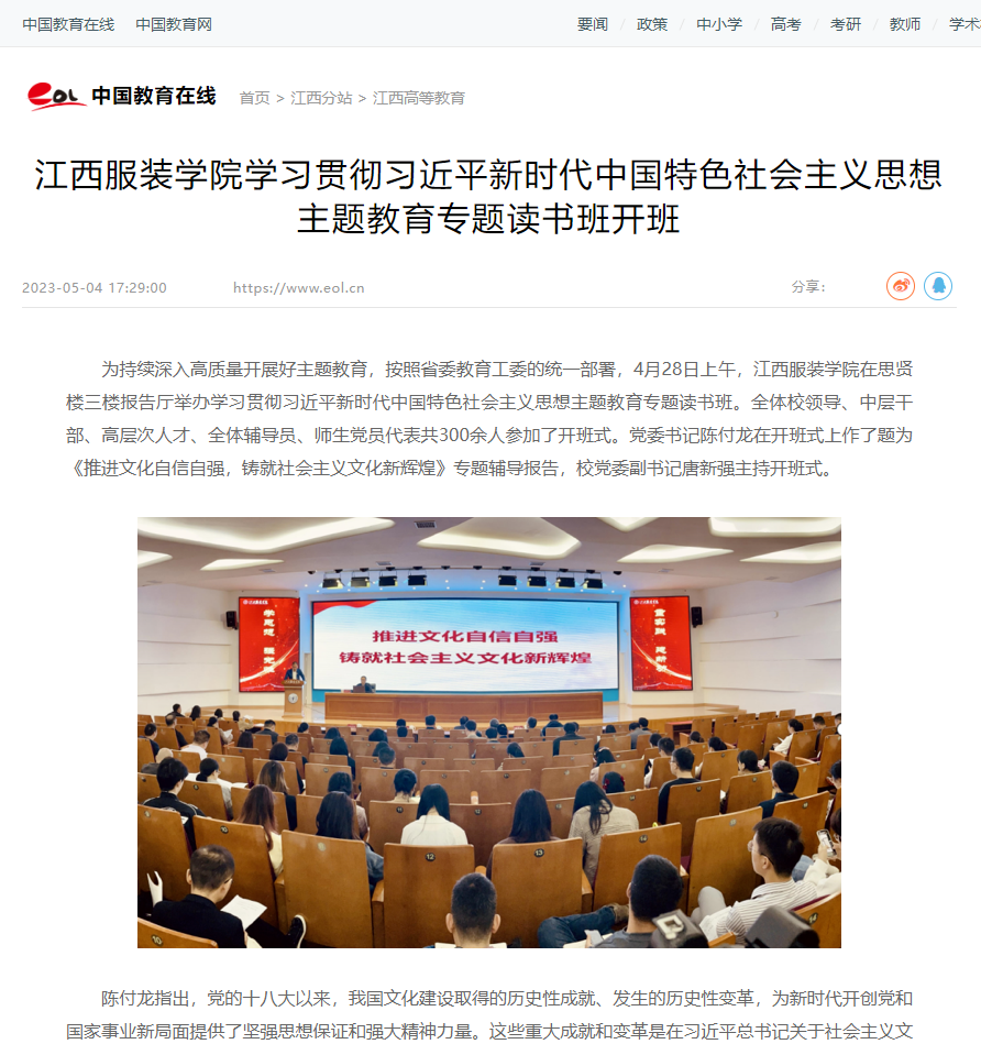 为持续深入高质量开展好主题教育,按照省委教育工委的统一部署,4月28日上午,江西服装学院在思贤楼三楼报告厅举办学习贯彻习近平新时代中国特色社会主义思想主题教育专题读书班。全体校领导、中层干部、高层次人才、全体辅导员、师生党员代表共300余人参加了开班式。党委书记陈付龙在开班式上作了题为《推进文化自信自强,铸就社会主义文化新辉煌》专题辅导报告,校党委副书记唐新强主持开班式。