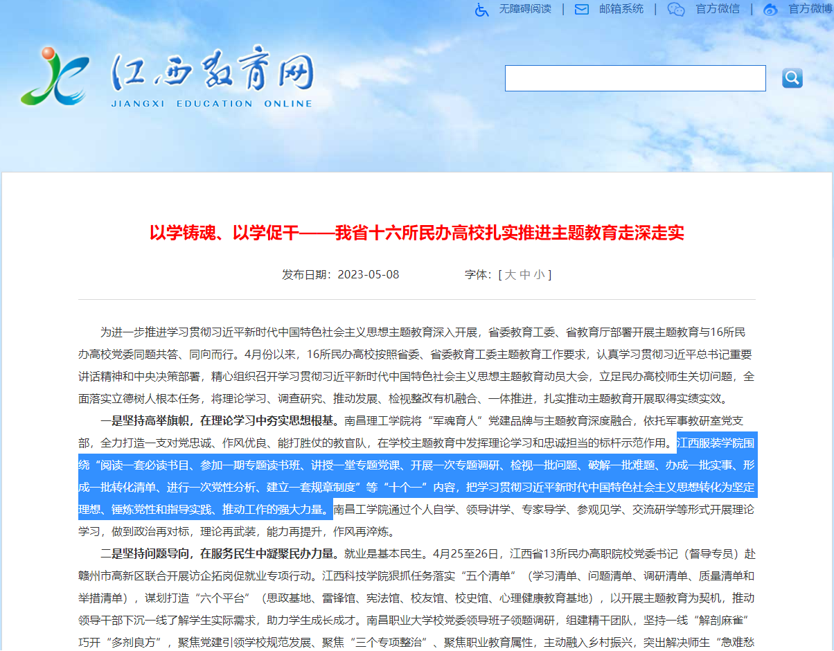 新闻链接:江西省教育厅官网:报道江西服装学院扎实推进主题教育走深走实