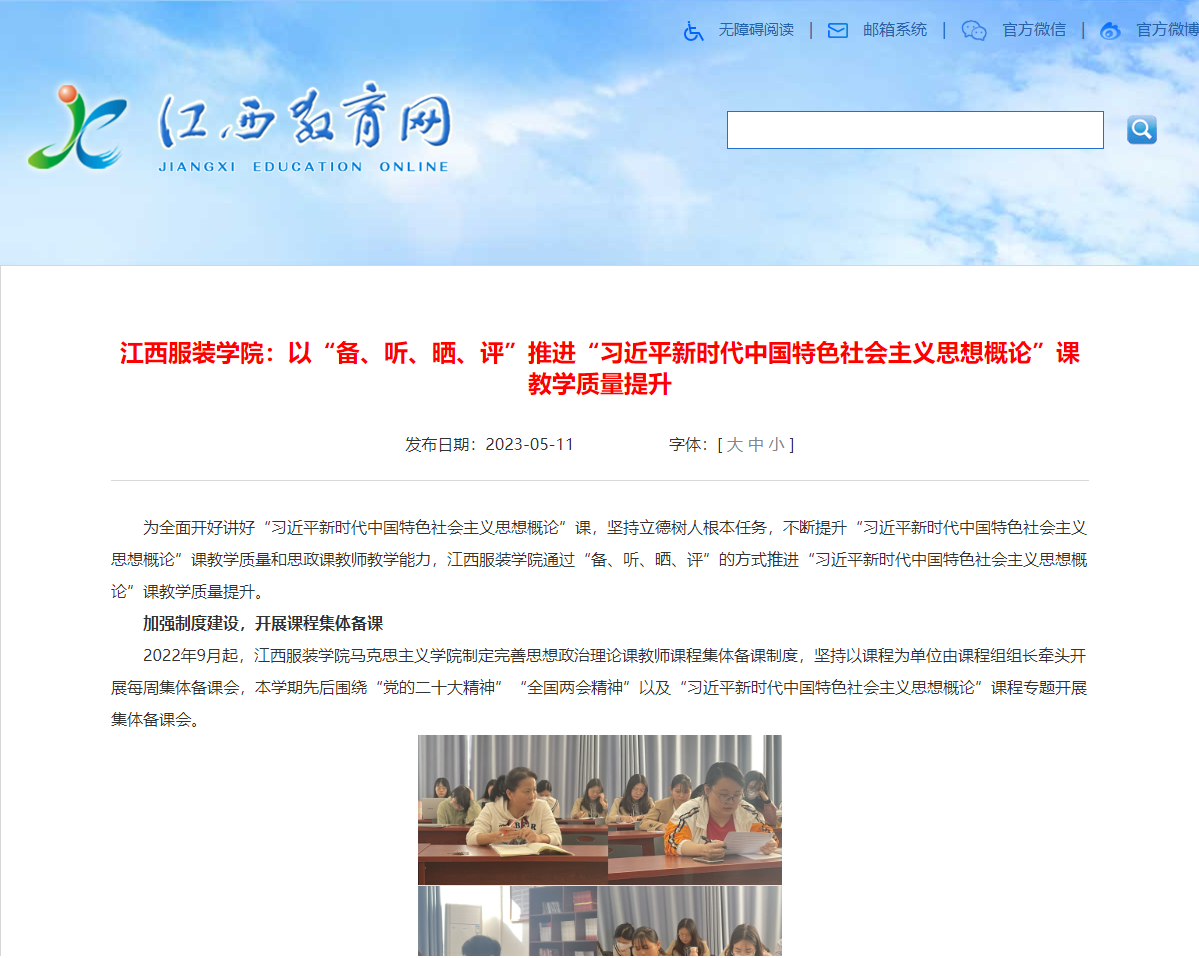 为全面开好讲好“习近平新时代中国特色社会主义思想概论”课,坚持立德树人根本任务,不断提升“习近平新时代中国特色社会主义思想概论”课教学质量和思政课教师教学能力,江西服装学院通过“备、听、晒、评”的方式推进“习近平新时代中国特色社会主义思想概论”课教学质量提升。