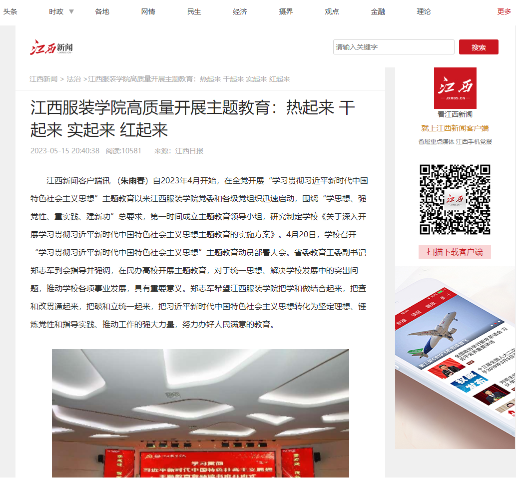 自2023年4月开始,在全党开展“学习贯彻习近平新时代中国特色社会主义思想”主题教育以来江西服装学院党委和各级党组织迅速启动,围绕“学思想、强党性、重实践、建新功”总要求,第一时间成立主题教育领导小组,研究制定学校《关于深入开展学习贯彻习近平新时代中国特色社会主义思想主题教育的实施方案》。4月20日,学校召开“学习贯彻习近平新时代中国特色社会主义思想”主题教育动员部署大会。省委教育工委副书记郑志军到会指导并强调,在民办高校开展主题教育,对于统一思想、解决学校发展中的突出问题,推动学校各项事业发展,具有重要意义。郑志军希望江西服装学院把学和做结合起来,把查和改贯通起来,把破和立统一起来,把习近平新时代中国特色社会主义思想转化为坚定理想、锤炼党性和指导实践、推动工作的强大力量,努力办好人民满意的教育。