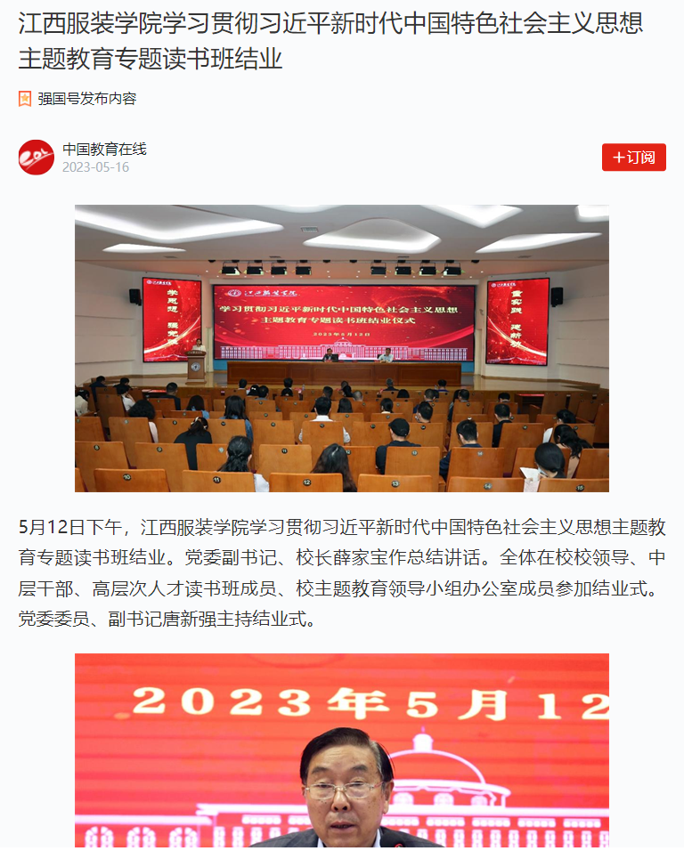 学习强国:江西服装学院学习贯彻习近平新时代中国特色社会主义思想主题教育专题读书班结业