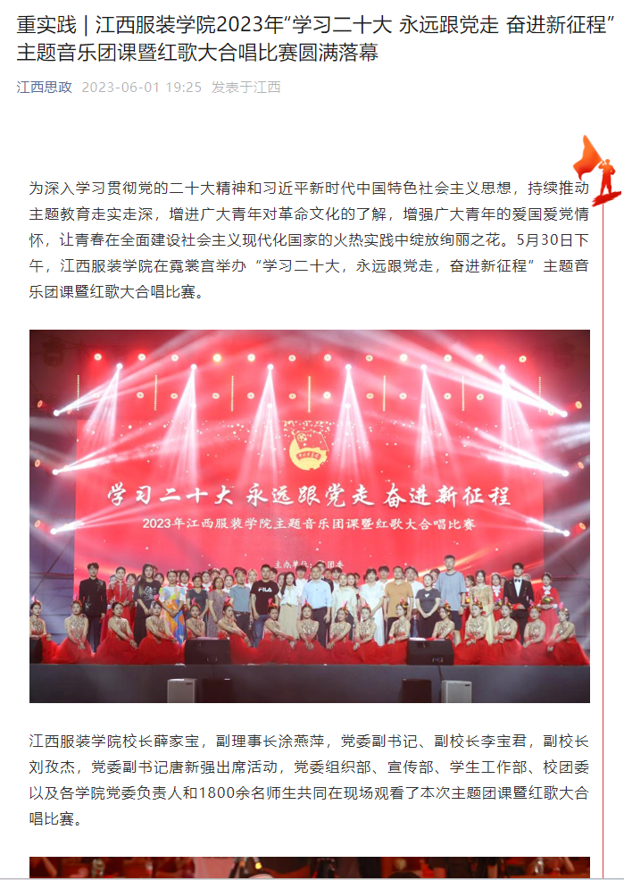 为深入学习贯彻党的二十大精神和习近平新时代中国特色社会主义思想,持续推动主题教育走实走深,增进广大青年对革命文化的了解,增强广大青年的爱国爱党情怀,让青春在全面建设社会主义现代化国家的火热实践中绽放绚丽之花。5月30日下午,江西服装学院在霓裳宫举办“学习二十大,永远跟党走,奋进新征程”主题音乐团课暨红歌大合唱比赛。