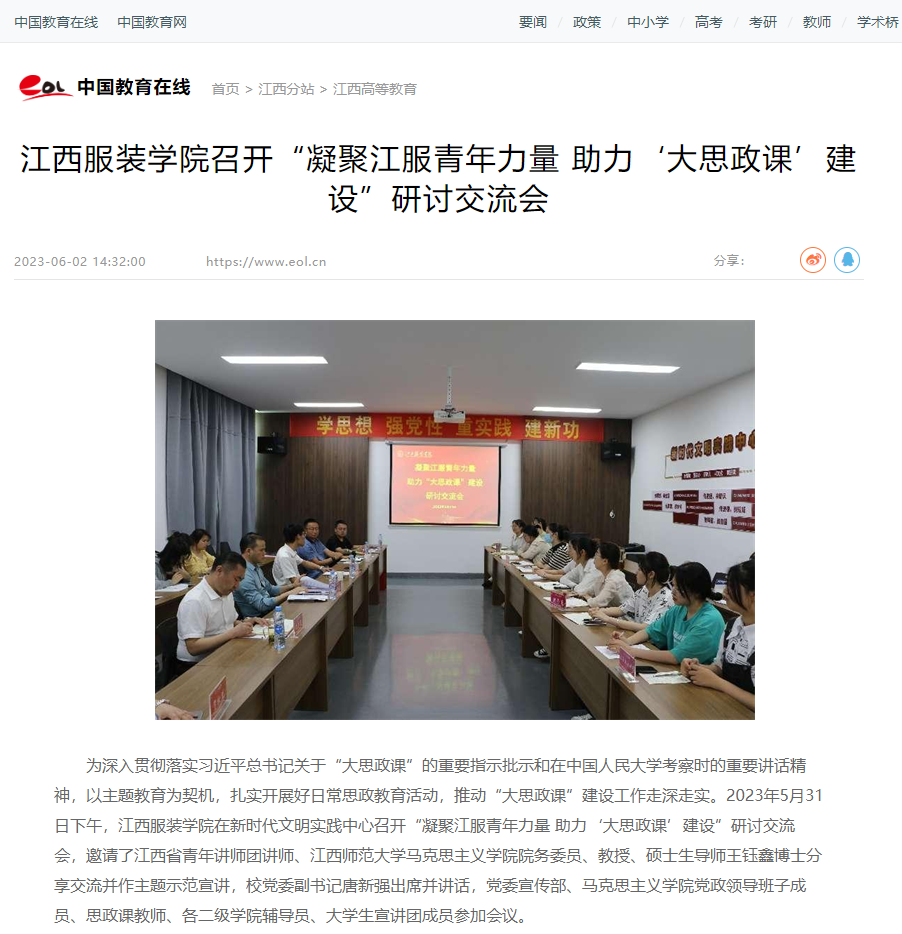 为深入贯彻落实习近平总书记关于“大思政课”的重要指示批示和在中国人民大学考察时的重要讲话精神,以主题教育为契机,扎实开展好日常思政教育活动,推动“大思政课”建设工作走深走实。2023年5月31日下午,江西服装学院在新时代文明实践中心召开“凝聚江服青年力量 助力‘大思政课’建设”研讨交流会,邀请了江西省青年讲师团讲师、江西师范大学马克思主义学院院务委员、教授、硕士生导师王钰鑫博士分享交流并作主题示范宣讲,校党委副书记唐新强出席并讲话,党委宣传部、马克思主义学院党政领导班子成员、思政课教师、各二级学院辅导员、大学生宣讲团成员参加会议。