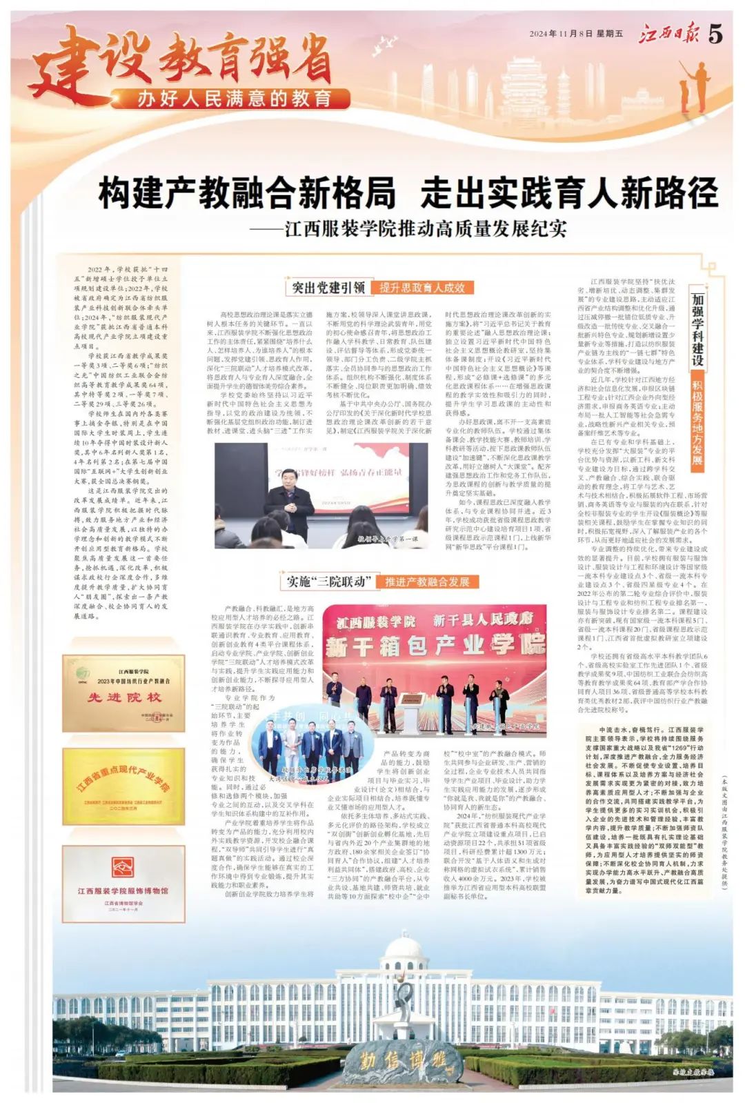 2024年11月08日,《江西日报》(第05版)刊发我校教育教学改革文章《构建产教融合新格局 走出实践育人新路径 ——江西服装学院推动高质量发展纪实》。