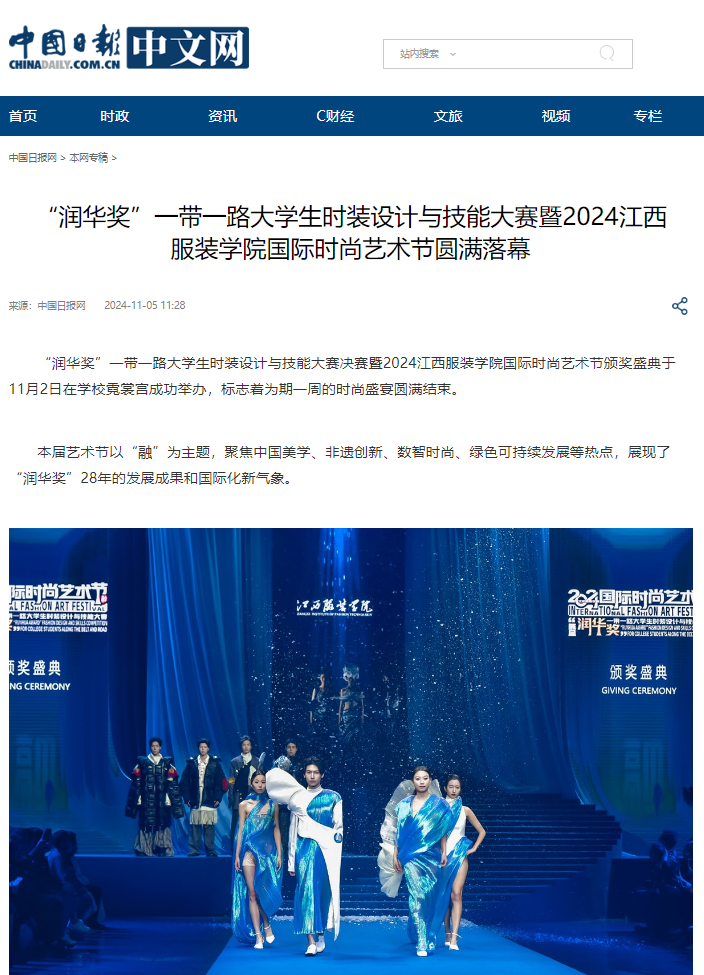 11月2日,“润华奖”一带一路大学生时装设计与技能大赛决赛暨2024江西服装学院国际时尚艺术节颁奖盛典在霓裳宫完美呈现,为期一周的时尚盛宴「融」汇至此,定格于辉煌一幕。2024年是江西服装学院举办“润华奖”的第28年,是首次迈向国际邀请境内外院校参赛的第一年。历经28年的沉淀和发展,从“江服杯”到“润华奖”再到“2024江西服装学院国际时尚艺术节”,已成为国内院校中具有一定规模和影响力的时尚教育成果展示平台。未来,江西服装学院将继续擦亮“国际时尚艺术节”这张时尚名片,成为推动中外服装领域交流合作的新起点,共同书写江服时尚文化国际化的新篇章。