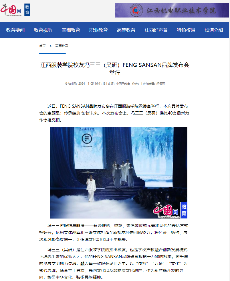 近日,FENG SANSAN品牌发布会在江西服装学院霓裳宫举行,本次品牌发布会的主题是:传承经典·创新未来。本次发布会上,冯三三(吴研)携其40套最新力作惊艳亮相。本次发布让观众欣赏到了江服校友独具魅力的艺术佳作。冯三三(吴研)以灵动的笔触描绘出不同时期和区域的时尚画卷,这些作品不仅展现了冯三三的才华和创意,也彰显出江西服装学院在培养应用型人才方面的深厚底蕴和前瞻视野。