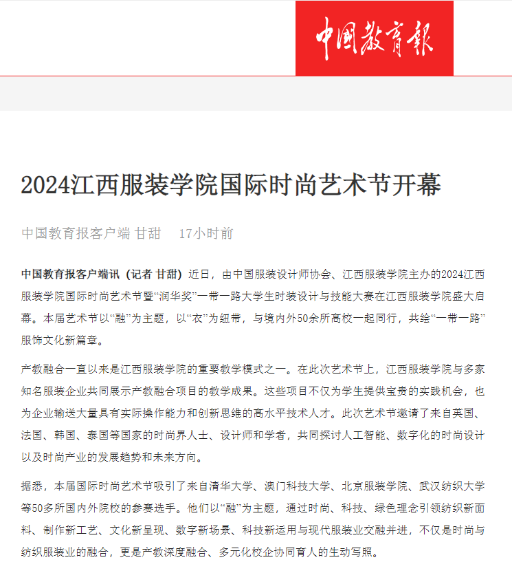 近日,由中国服装设计师协会、江西服装学院主办的2024江西服装学院国际时尚艺术节暨“润华奖”一带一路大学生时装设计与技能大赛在江西服装学院盛大启幕。本届艺术节以“融”为主题,以“衣”为纽带,与境内外50余所高校一起同行,共绘“一带一路”服饰文化新篇章。
