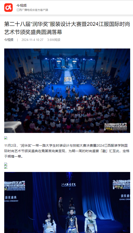11月2日,“润华奖”一带一路大学生时装设计与技能大赛决赛暨2024江西服装学院国际时尚艺术节颁奖盛典在霓裳宫完美呈现,为期一周的时尚盛宴「融」汇至此,定格于辉煌一幕。2024年是江西服装学院举办“润华奖”的第28年,是首次迈向国际邀请境内外院校参赛的第一年。历经28年的沉淀和发展,从“江服杯”到“润华奖”再到“2024江西服装学院国际时尚艺术节”,已成为国内院校中具有一定规模和影响力的时尚教育成果展示平台。未来,江西服装学院将继续擦亮“国际时尚艺术节”这张时尚名片,成为推动中外服装领域交流合作的新起点,共同书写江服时尚文化国际化的新篇章。