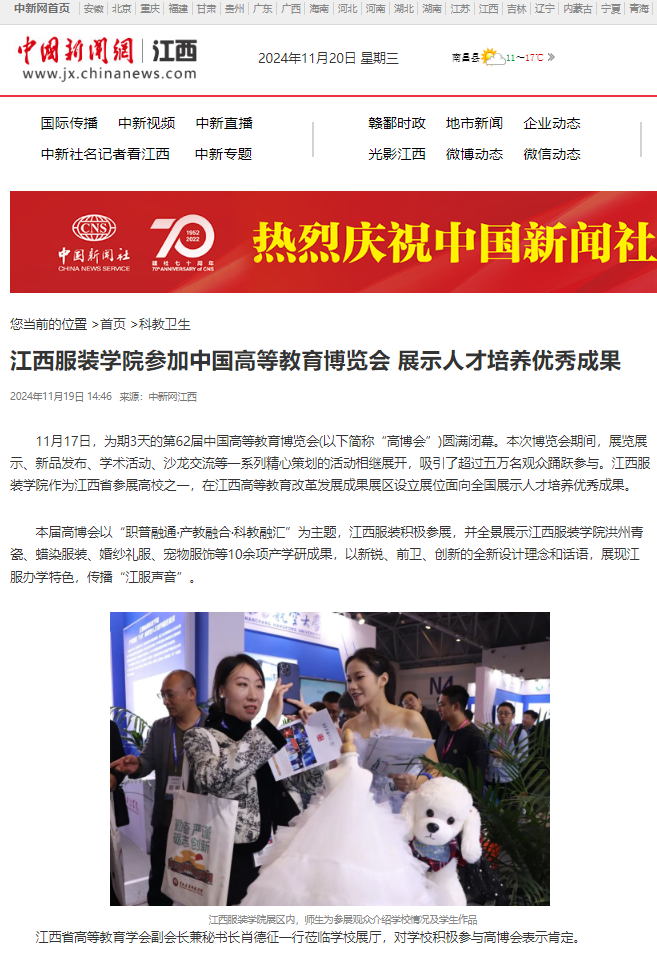 11月17日,为期3天的第62届中国高等教育博览会在重庆国际博览中心圆满闭幕。本次博览会期间,展览展示、新品发布、学术活动、沙龙交流等一系列精心策划的活动相继展开,吸引了超过五万名观众踊跃参与。江西服装学院作为江西省参展高校之一,在江西高等教育改革发展成果展区设立展位面向全国展示人才培养优秀成果。本届高博会以“职普融通·产教融合·科教融汇”为主题,江西服装学院积极参展,并全景展示江西服装学院洪州青瓷、蜡染服装、婚纱礼服、宠物服饰等10余项产学研成果,以新锐、前卫、创新的全新设计理念和话语,展现江服办学特色,传播“江服声音”。