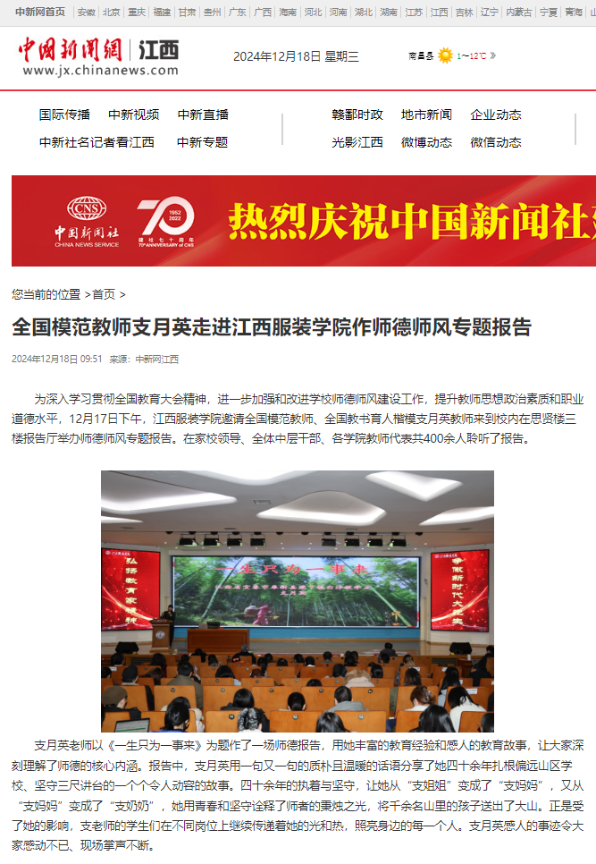 为深入学习贯彻全国教育大会精神,进一步加强和改进学校师德师风建设工作,提升教师思想政治素质和职业道德水平,12月17日下午,江西服装学院邀请全国模范教师、全国教书育人楷模支月英教师来到校内在思贤楼三楼报告厅举办师德师风专题报告。在家校领导、全体中层干部、各学院教师代表共400余人聆听了报告。