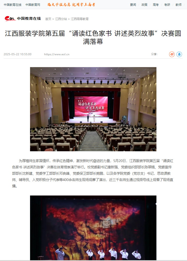 为厚植师生家国情怀,传承红色精神,激发新时代奋进的力量,5月20日,江西服装学院第五届“诵读红色家书 讲述英烈故事”决赛在体育馆表演厅举行。校党委副书记唐新强、党委组织部部长陈翠娥、党委宣传部部长沈新建、党委学工部部长邓良峰、党委保卫部部长鲍鹏,以及各学院党委(党总支)书记,思政课教师、辅导员、入党积极分子代表等400余名师生现场观摩了演出,近三千名师生通过视频号线上观看了现场直播。