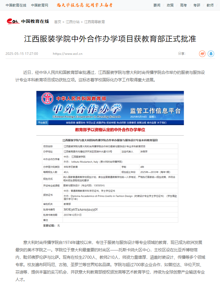 近日,经中华人民共和国教育部审批通过,江西服装学院与意大利时尚传播学院合作举办的服装与服饰设计专业本科教育项目成功获批立项。这标志着学校国际化办学工作取得重大进展。此次中外合作办学项目的成功获批,是江西服装学院国际化办学进程中的重要一步,标志着学校在国际合作办学方面实现零的突破,迈出了具有里程碑意义的关键一步。该项目将有效优化学校中外合作办学结构,提升合作层次,加大国外优质教育资源引进力度,深化国际教育合作,推动人才培养国际化水平的提高和专业人才培养模式的创新,是学校落实立德树人根本任务、推进内涵式发展的又一重要成果。