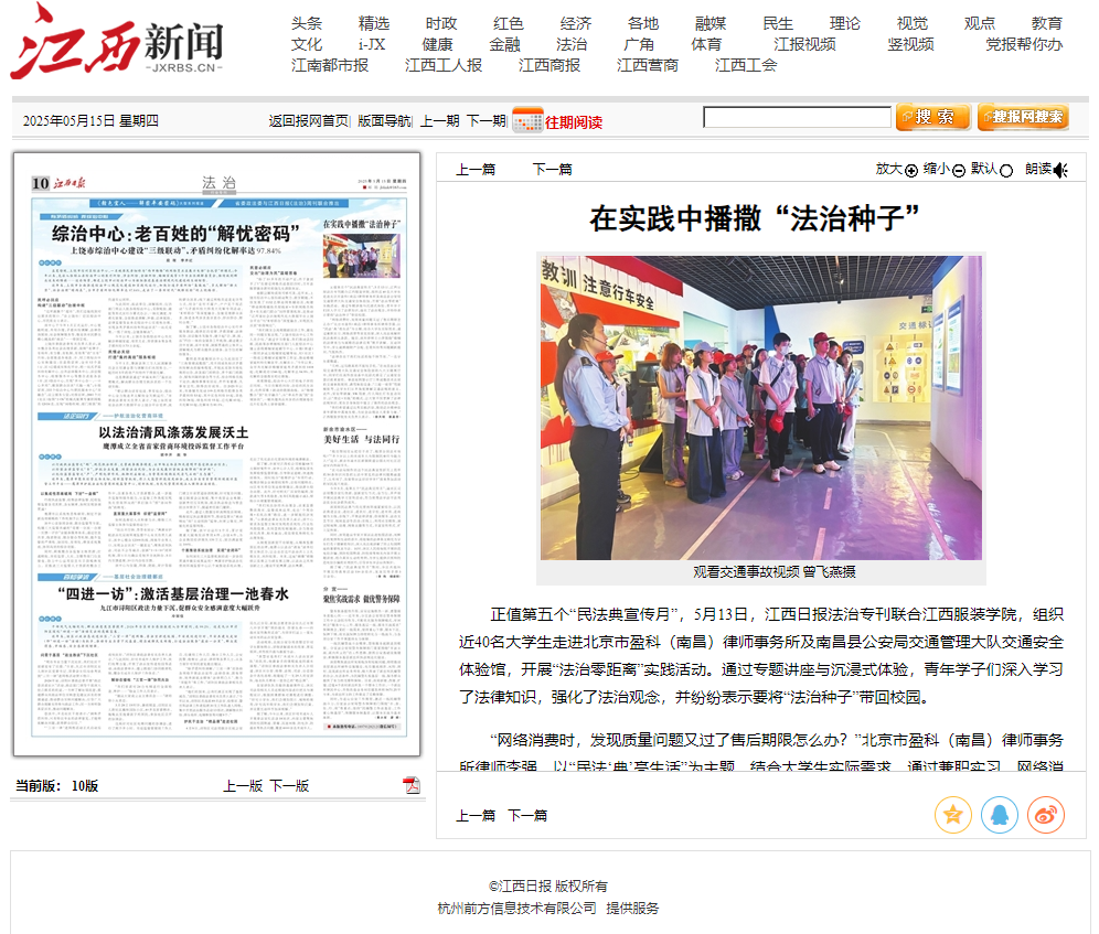 《江西日报》(2025年5月15日 第10版)刊登报道:正值第五个“民法典宣传月”,5月13日,江西日报法治专刊联合江西服装学院,组织近40名大学生走进北京市盈科(南昌)律师事务所及南昌县公安局交通管理大队交通安全体验馆,开展“法治零距离”实践活动。通过专题讲座与沉浸式体验,青年学子们深入学习了法律知识,强化了法治观念,并纷纷表示要将“法治种子”带回校园。