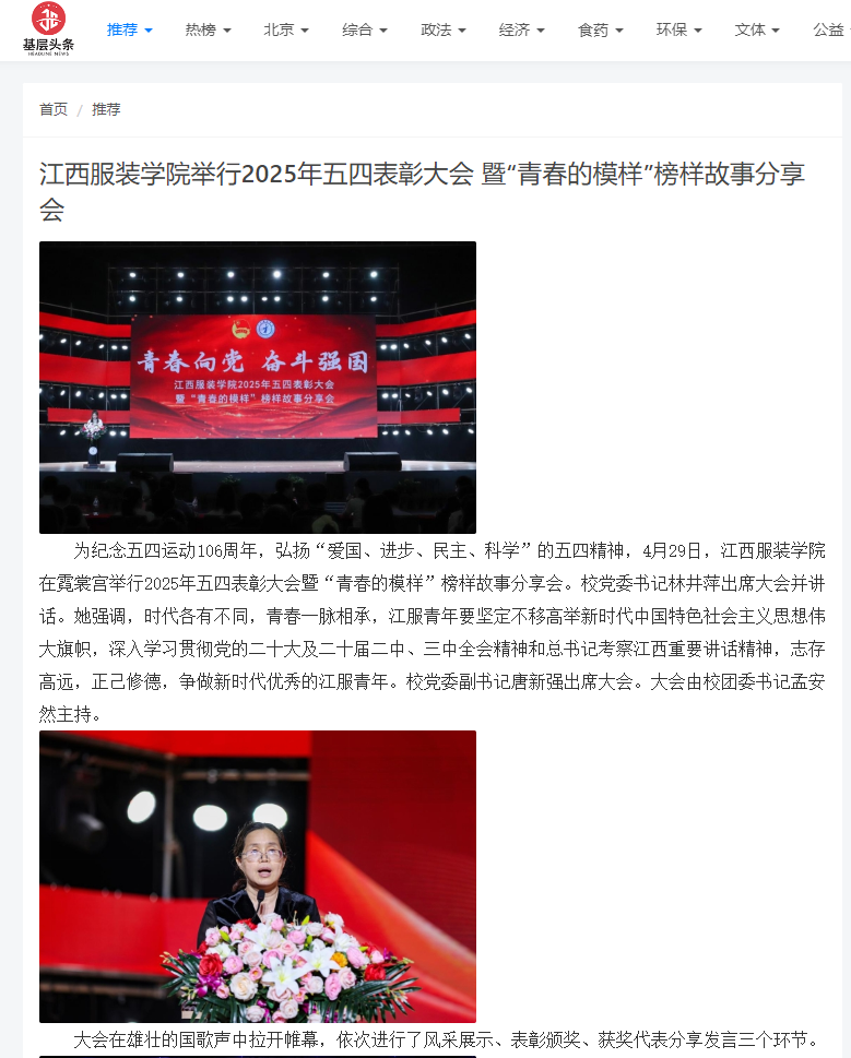 为纪念五四运动106周年,弘扬“爱国、进步、民主、科学”的五四精神,4月29日,江西服装学院在霓裳宫举行2025年五四表彰大会暨“青春的模样”榜样故事分享会。校党委书记林井萍出席大会并讲话。她强调,时代各有不同,青春一脉相承,江服青年要坚定不移高举新时代中国特色社会主义思想伟大旗帜,深入学习贯彻党的二十大及二十届二中、三中全会精神和总书记考察江西重要讲话精神,志存高远,正己修德,争做新时代优秀的江服青年。校党委副书记唐新强出席大会。大会由校团委书记孟安然主持。