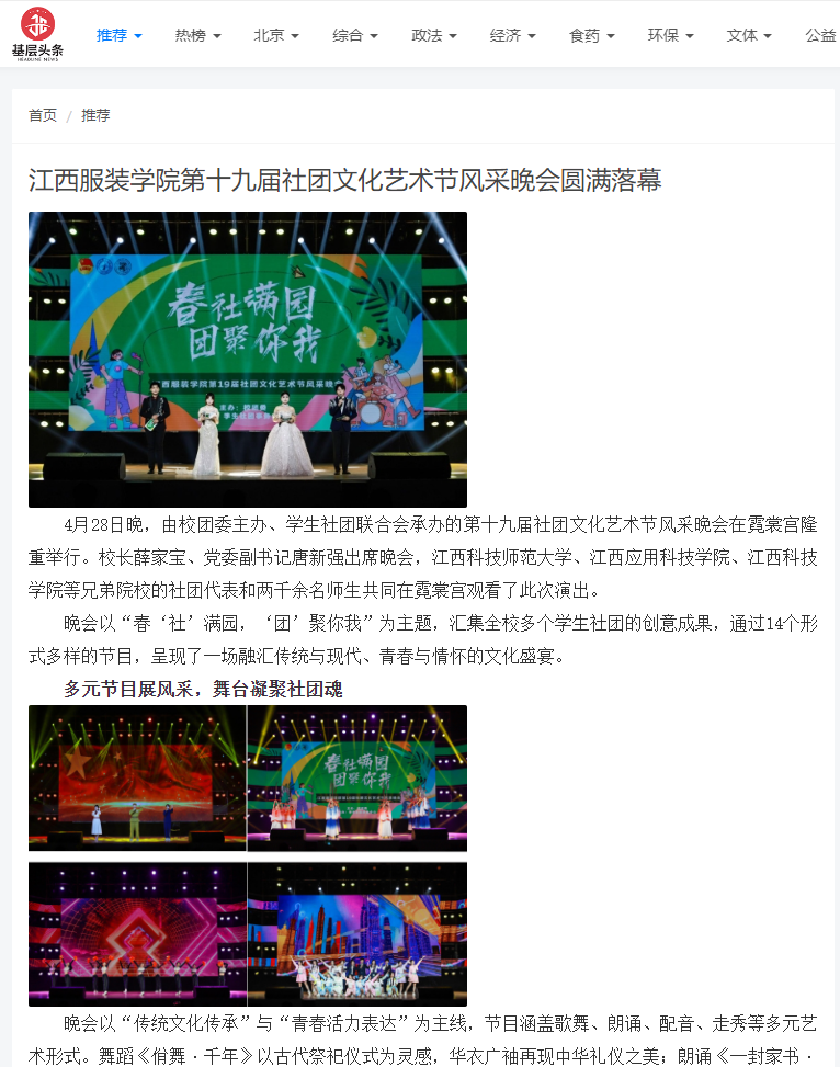 4月28日晚,由校团委主办、学生社团联合会承办的第十九届社团文化艺术节风采晚会在霓裳宫隆重举行。校长薛家宝、党委副书记唐新强出席晚会,江西科技师范大学、江西应用科技学院、江西科技学院等兄弟院校的社团代表和两千余名师生共同在霓裳宫观看了此次演出。晚会以“春‘社’满园,‘团’聚你我”为主题,汇集全校多个学生社团的创意成果,通过14个形式多样的节目,呈现了一场融汇传统与现代、青春与情怀的文化盛宴。