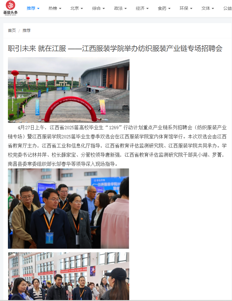4月27日上午,江西省2025届高校毕业生“1269”行动计划重点产业链系列招聘会(纺织服装产业链专场)暨江西服装学院2025届毕业生春季双选会在江西服装学院室内体育馆举行。本次双选会由江西省教育厅主办,江西省工业和信息化厅指导,江西省教育评估监测研究院、江西服装学院共同承办。学校党委书记林井萍、校长薛家宝、分管校领导唐新强,江西省教育评估监测研究院干部吴小湖、罗菁,南昌县委常委组织部长邬春华等领导深入现场指导。
