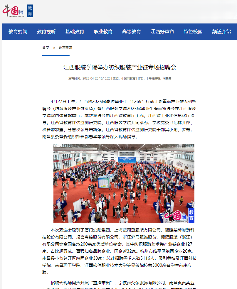 4月27日上午,江西省2025届高校毕业生“1269”行动计划重点产业链系列招聘会(纺织服装产业链专场)暨江西服装学院2025届毕业生春季双选会在江西服装学院室内体育馆举行。本次双选会由江西省教育厅主办,江西省工业和信息化厅指导,江西省教育评估监测研究院、江西服装学院共同承办。学校党委书记林井萍、校长薛家宝、分管校领导唐新强,江西省教育评估监测研究院干部吴小湖、罗菁,南昌县委常委组织部长邬春华等领导深入现场指导。