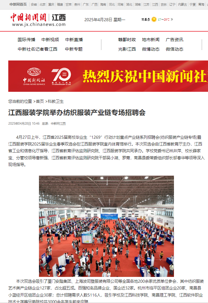 4月27日上午,江西省2025届高校毕业生“1269”行动计划重点产业链系列招聘会(纺织服装产业链专场)暨江西服装学院2025届毕业生春季双选会在江西服装学院室内体育馆举行。本次双选会由江西省教育厅主办,江西省工业和信息化厅指导,江西省教育评估监测研究院、江西服装学院共同承办。学校党委书记林井萍、校长薛家宝、分管校领导唐新强,江西省教育评估监测研究院干部吴小湖、罗菁,南昌县委常委组织部长邬春华等领导深入现场指导。
