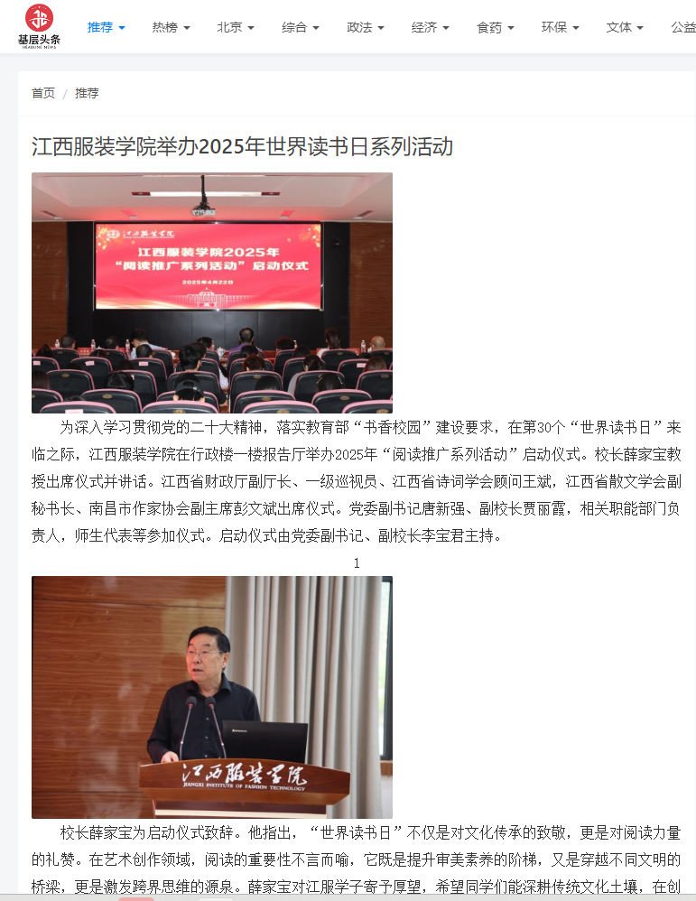 为深入学习贯彻党的二十大精神,落实教育部“书香校园”建设要求,在第30个“世界读书日”来临之际,江西服装学院在行政楼一楼报告厅举办2025年“阅读推广系列活动”启动仪式。校长薛家宝教授出席仪式并讲话。江西省财政厅副厅长、一级巡视员、江西省诗词学会顾问王斌,江西省散文学会副秘书长、南昌市作家协会副主席彭文斌出席仪式。党委副书记唐新强、副校长贾丽霞,相关职能部门负责人,师生代表等参加仪式。启动仪式由党委副书记、副校长李宝君主持。