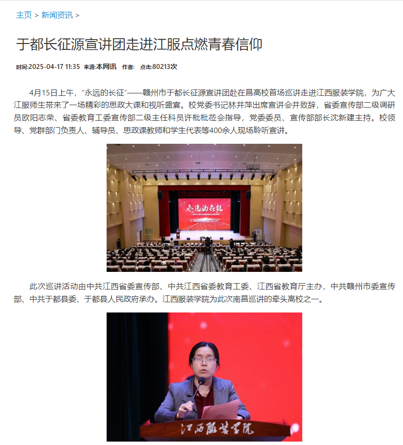 4月15日上午,“永远的长征”——赣州市于都长征源宣讲团赴在昌高校首场巡讲走进江西服装学院,为广大江服师生带来了一场精彩的思政大课和视听盛宴。校党委书记林井萍出席宣讲会并致辞,省委宣传部二级调研员欧阳志荣、省委教育工委宣传部二级主任科员许枇枇莅会指导,党委委员、宣传部部长沈新建主持。校领导、党群部门负责人、辅导员、思政课教师和学生代表等400余人现场聆听宣讲。