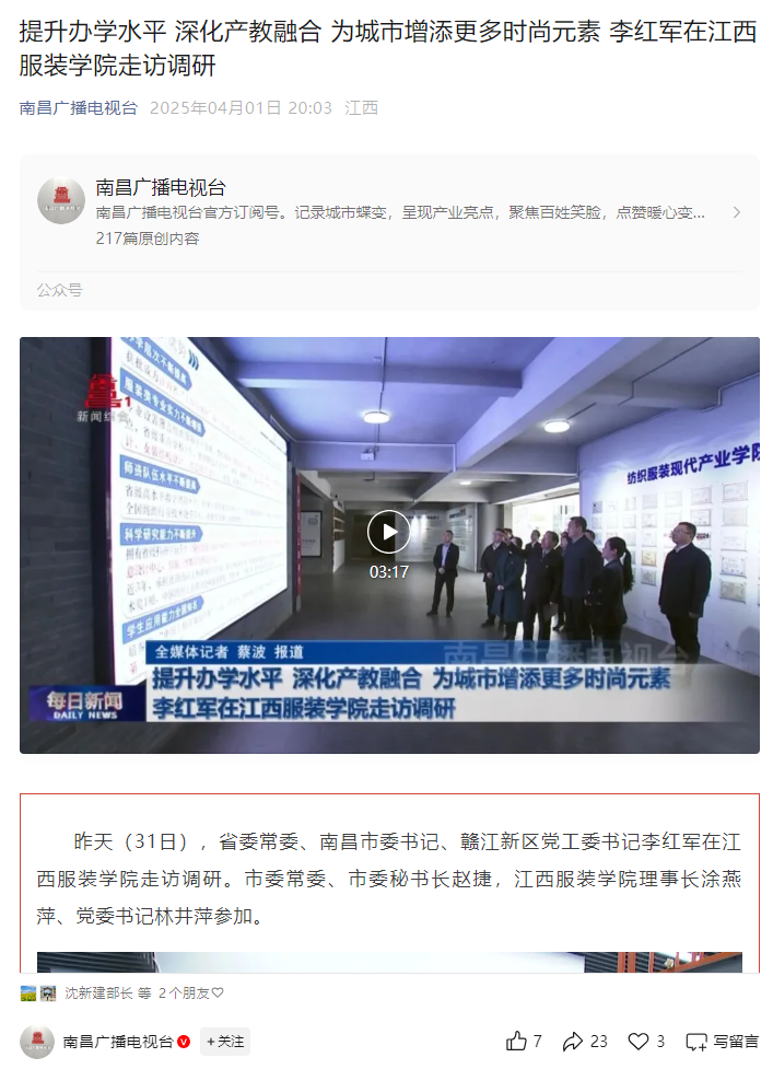 调研中,李红军实地察看学校CHEN.1988时尚女装产业学院、好望角手工皮具工作室、郭晓强劳模创新工作室、南昌市服装数字化系统设计重点实验室等,参观服装文化展览,现场观看师生织绣技艺展示,与学校负责人和师生亲切交流,详细了解学校发展、办学特色、产教融合、人才培养等情况。李红军充分肯定学校工作取得的成效,对学校全力服务南昌针纺产业发展表示感谢。李红军指出,服装行业充满着创意和创新,时尚产业大有可为。希望学校进一步加强学科专业建设,强化教育教学管理,全面提升办学水平,努力培养更多高素质专业人才,持续推动服装行业创新发展;充分发挥专业优势,运用现代技术,全面展现中国服饰从古至今的演变过程,传承好中华民族优秀传统服饰文化,让传统服饰在时尚产业领域焕发新的光彩;积极参与南昌举办的重大活动,全方位展示学校师生创作的富有时代特征的服装创意设计产品,为城市增添更多时尚元素,进一步展现城市魅力、激发城市活力;聚焦江西省“1269”行动计划和南昌市“8810”行动计划,紧密对接青山湖区针纺服装产业相关企业,深化产教融合、校企合作,共建产业学院、实训基地,携手推动南昌针纺服装产业高质量发展。
