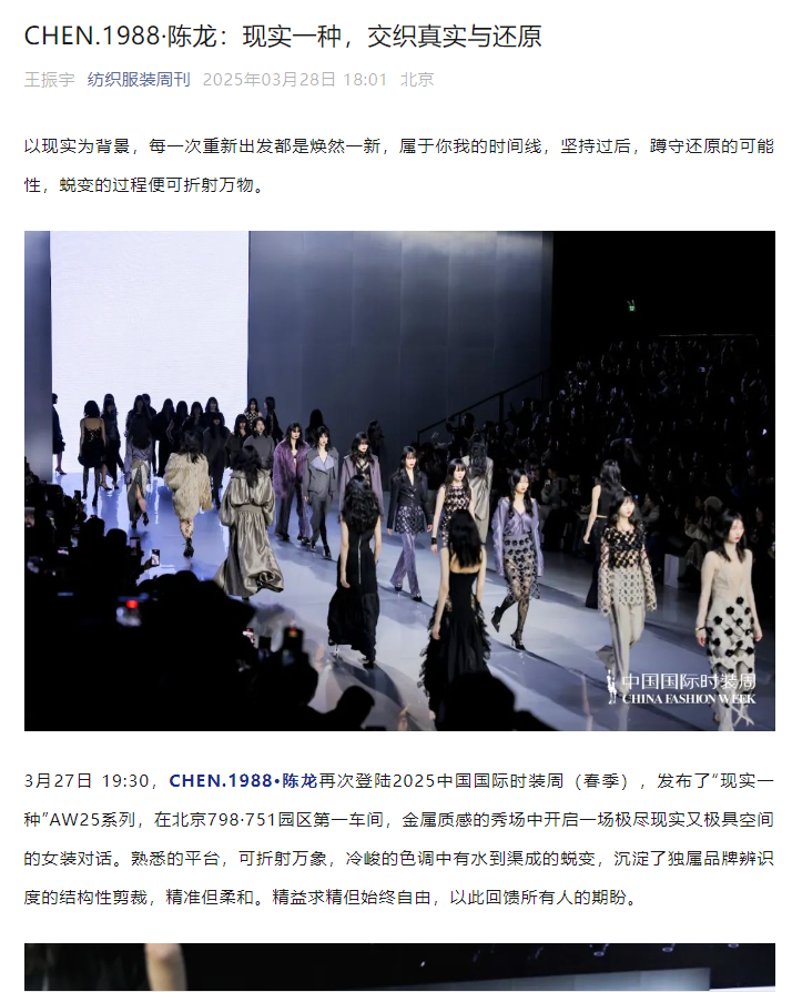 3月27日 19:30,CHEN.1988·陈龙再次登陆2025中国国际时装周(春季),发布了“现实一种”AW25系列,在北京798·751园区第一车间,金属质感的秀场中开启一场极尽现实又极具空间的女装对话。熟悉的平台,可折射万象,冷峻的色调中有水到渠成的蜕变,沉淀了独属品牌辨识度的结构性剪裁,精准但柔和。精益求精但始终自由,以此回馈所有人的期盼。