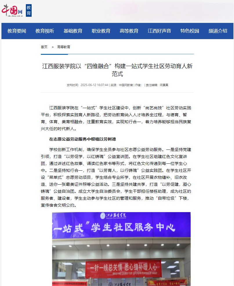 江西服装学院在“一站式”学生社区建设中,创新“尚艺尚技”社区劳动实践平台,积极探索实践育人新路径,把劳动教育纳入人才培养全过程,与德育、智育、体育、美育相融合,注重教育实效,实现知行合一,着力培养能够担当民族复兴大任的时代新人。