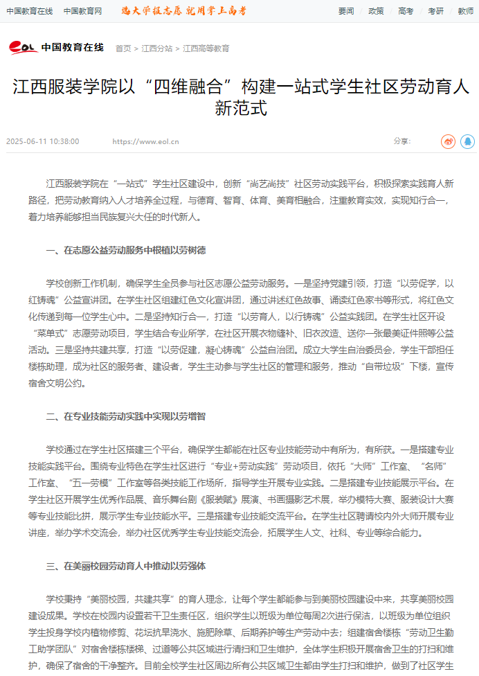 江西服装学院在“一站式”学生社区建设中,创新“尚艺尚技”社区劳动实践平台,积极探索实践育人新路径,把劳动教育纳入人才培养全过程,与德育、智育、体育、美育相融合,注重教育实效,实现知行合一,着力培养能够担当民族复兴大任的时代新人。