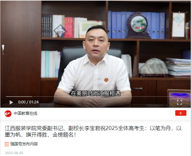 学习强国:江西服装学院党委副书记、副校长李宝君祝2025全体高考生:以笔为舟,以墨为帆,旗开得胜,金榜题名!