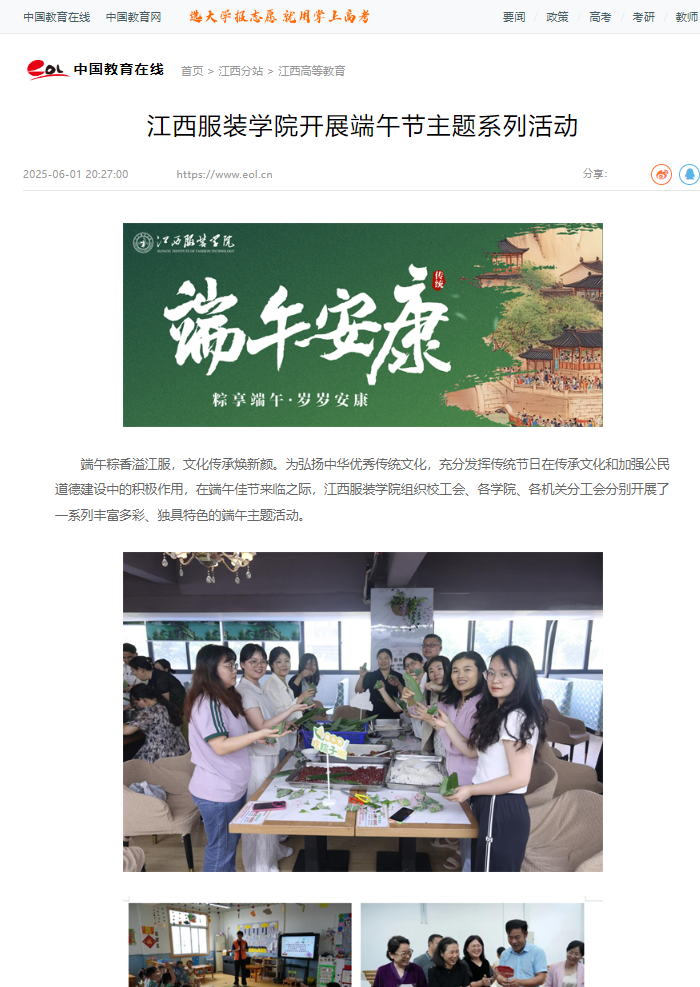 端午粽香溢江服,文化传承焕新颜。为弘扬中华优秀传统文化,充分发挥传统节日在传承文化和加强公民道德建设中的积极作用,在端午佳节来临之际,江西服装学院组织校工会、各学院、各机关分工会分别开展了一系列丰富多彩、独具特色的端午主题活动。从非遗工坊到智慧闯关,从童声琅琅到巧手竞技,端午节系列活动不仅彰显了浓厚的传统文化底蕴,也体现了学校的青春活力,为师生呈现了一场集文化深度、专业特色与节日氛围于一体的端午文化盛宴。未来,学校将继续大力弘扬中华民族优秀文化,持续增强师生对中华民族的认同感和自豪感,为传统节日注入新时代动能,为创建美丽校园书写育人华章。