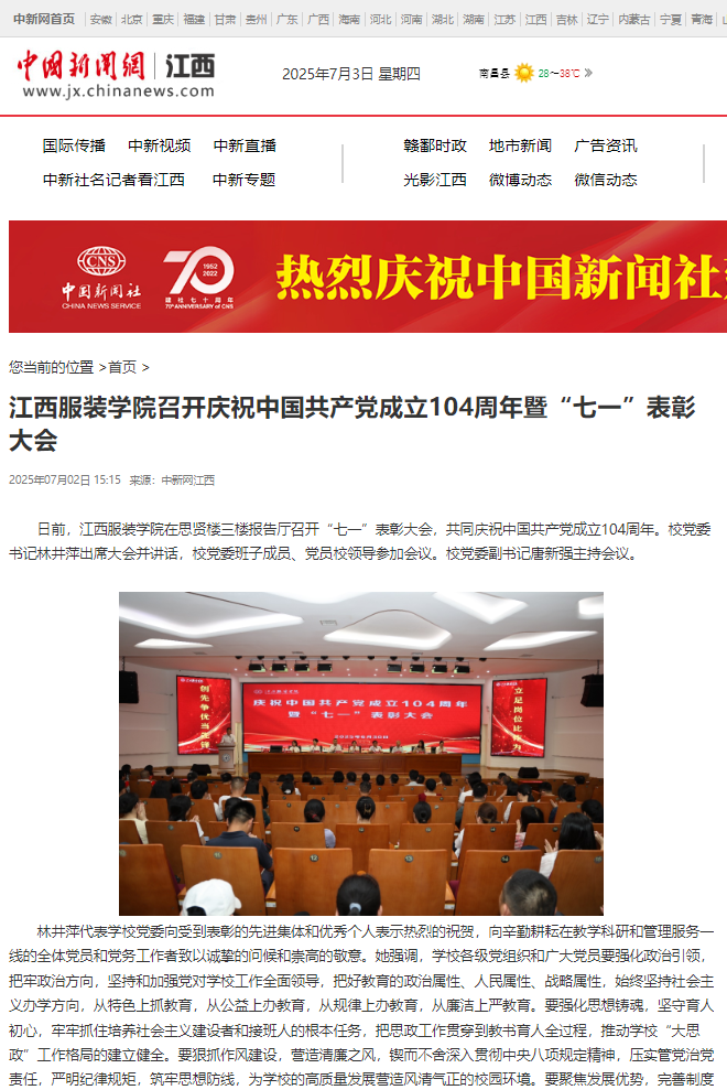 中国新闻网:江西服装学院召开庆祝中国共产党成立104周年暨“七一”表彰大会