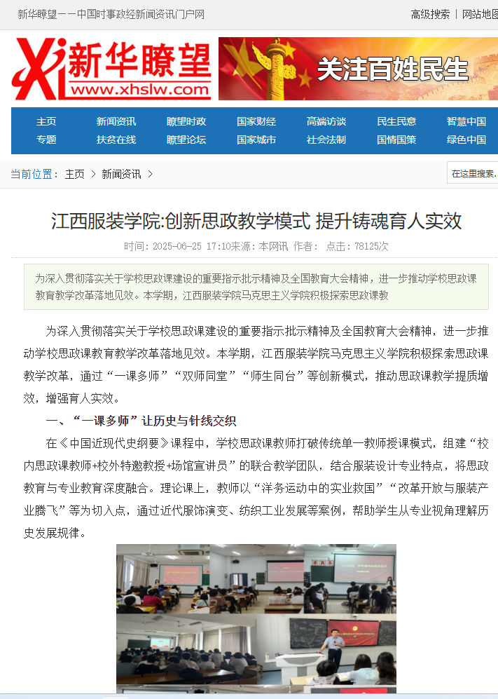 为深入贯彻落实关于学校思政课建设的重要指示批示精神及全国教育大会精神,进一步推动学校思政课教育教学改革落地见效。本学期,江西服装学院马克思主义学院积极探索思政课教学改革,通过“一课多师”“双师同堂”“师生同台”等创新模式,推动思政课教学提质增效,增强育人实效。