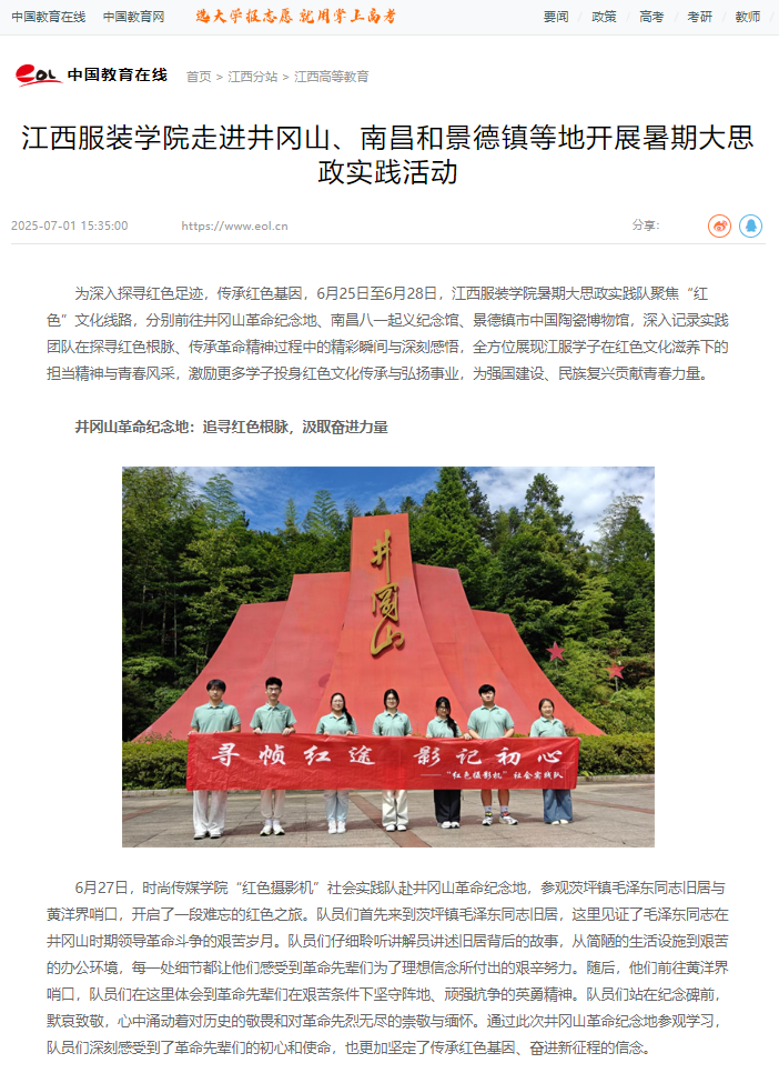 为深入探寻红色足迹,传承红色基因,6月25日至6月28日,江西服装学院暑期大思政实践队聚焦“红色”文化线路,分别前往井冈山革命纪念地、南昌八一起义纪念馆、景德镇市中国陶瓷博物馆,深入记录实践团队在探寻红色根脉、传承革命精神过程中的精彩瞬间与深刻感悟,全方位展现江服学子在红色文化滋养下的担当精神与青春风采,激励更多学子投身红色文化传承与弘扬事业,为强国建设、民族复兴贡献青春力量。