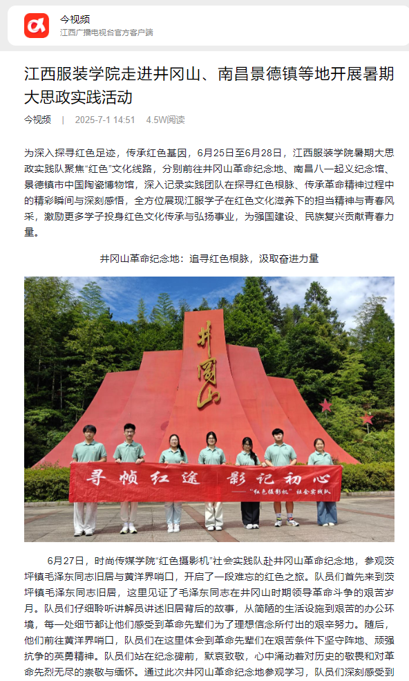 为深入探寻红色足迹,传承红色基因,6月25日至6月28日,江西服装学院暑期大思政实践队聚焦“红色”文化线路,分别前往井冈山革命纪念地、南昌八一起义纪念馆、景德镇市中国陶瓷博物馆,深入记录实践团队在探寻红色根脉、传承革命精神过程中的精彩瞬间与深刻感悟,全方位展现江服学子在红色文化滋养下的担当精神与青春风采,激励更多学子投身红色文化传承与弘扬事业,为强国建设、民族复兴贡献青春力量。