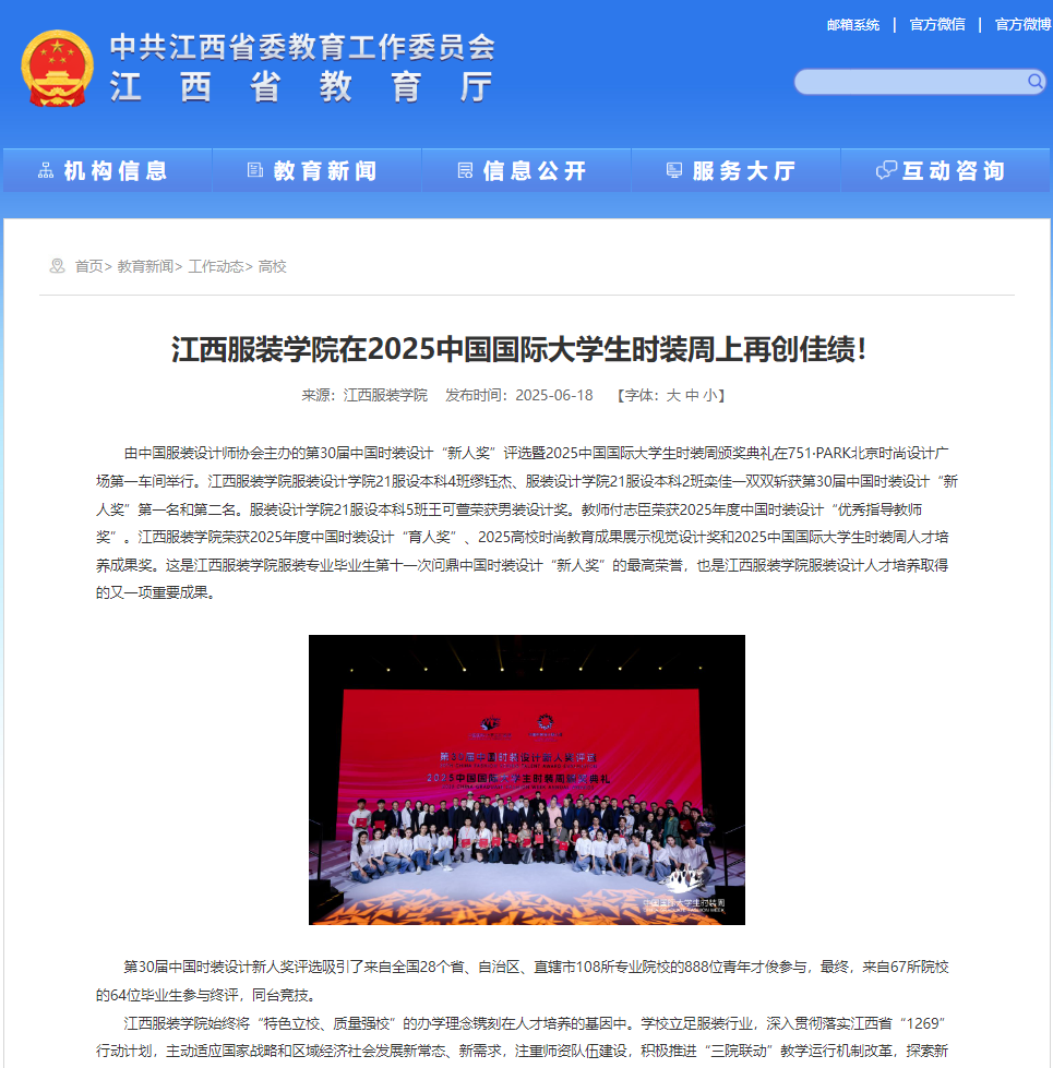 由中国服装设计师协会主办的第30届中国时装设计“新人奖”评选暨2025中国国际大学生时装周颁奖典礼在751·PARK北京时尚设计广场第一车间举行。江西服装学院服装设计学院21服设本科4班缪钰杰、服装设计学院21服设本科2班栾佳一双双斩获第30届中国时装设计“新人奖”第一名和第二名。服装设计学院21服设本科5班王可萱荣获男装设计奖。教师付志臣荣获2025年度中国时装设计“优秀指导教师奖”。江西服装学院荣获2025年度中国时装设计“育人奖”、2025高校时尚教育成果展示视觉设计奖和2025中国国际大学生时装周人才培养成果奖。这是江西服装学院服装专业毕业生第十一次问鼎中国时装设计“新人奖”的最高荣誉,也是江西服装学院服装设计人才培养取得的又一项重要成果。