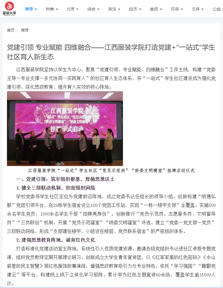江西服装学院坚持以学生为中心,聚焦“党建引领、专业赋能、四维融合”工作主线,构建“党委主导—专业支撑—多元协同—实践育人”的社区育人生态体系,将“一站式”学生社区建设成为强化党建引领、深化思政教育、提升育人实效的核心阵地。