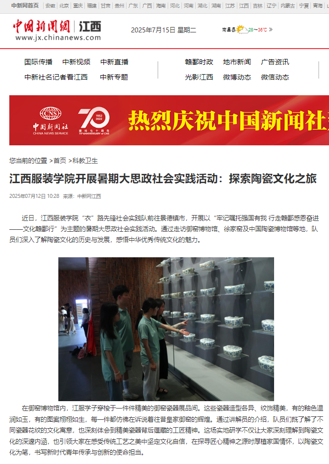 近日,江西服装学院“衣”路先锋社会实践队前往景德镇市,开展以“牢记嘱托强国有我 行走赣鄱感恩奋进——文化赣鄱行”为主题的暑期大思政社会实践活动。通过走访御窑博物馆、徐家窑及中国陶瓷博物馆等地,队员们深入了解陶瓷文化的历史与发展,感悟中华优秀传统文化的魅力。
