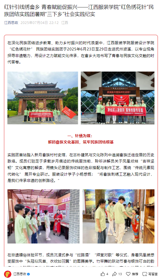 在深化民族团结进步教育、助力乡村振兴的时代浪潮中,江西服装学院服装设计学院“红色绣花针” 民族团结实践团于2025年6月23日至29日走进抚州资溪,以专业视角探寻非遗魅力,用设计之力赋能文化传承,在畲乡大地书写了青春与民族文化交融的时代答卷。