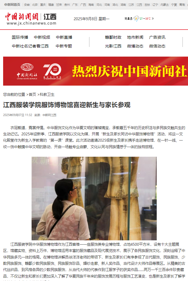 衣冠载道,霓裳传情。中华服饰文化作为华夏文明的璀璨瑰宝,承载着五千年的历史积淀与多民族交融共生的生动记忆。2025年迎新季,江西服装学院以文化为媒,开展“新生及家长同访中华服饰博物馆”活动,将这一文化殿堂作为新生入学教育的“第一课”课堂。此次活动邀请2025级新生及家长携手走进博物馆,在一针一线、一纹一饰中触摸中华文明的脉动,开启一场融专业启蒙、文化认同与民族情感于一体的独特旅程。