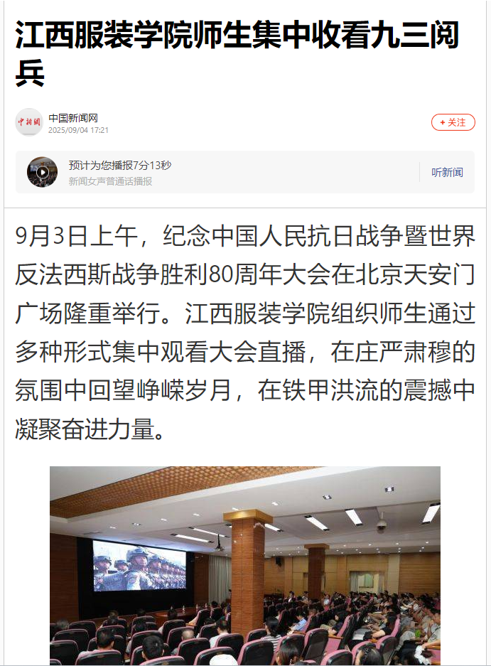 9月3日上午,纪念中国人民抗日战争暨世界反法西斯战争胜利80周年大会在北京天安门广场举行。江西服装学院组织师生通过多种形式集中观看大会直播,认真聆听习近平总书记在纪念大会上的重要讲话,在庄严肃穆的氛围中回望峥嵘岁月,在铁甲洪流的震撼中凝聚奋进力量。