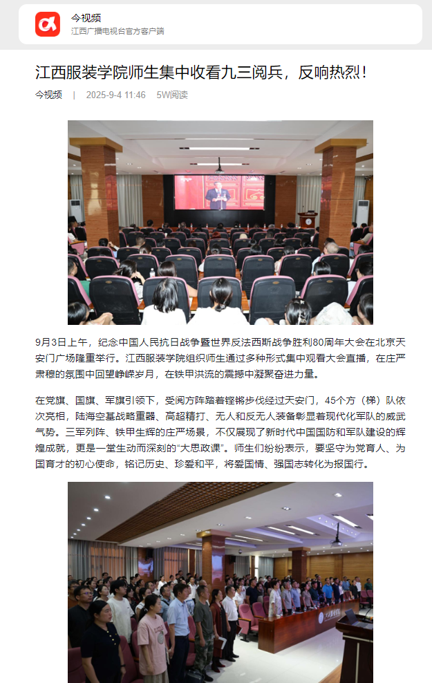 9月3日上午,纪念中国人民抗日战争暨世界反法西斯战争胜利80周年大会在北京天安门广场举行。江西服装学院组织师生通过多种形式集中观看大会直播,认真聆听习近平总书记在纪念大会上的重要讲话,在庄严肃穆的氛围中回望峥嵘岁月,在铁甲洪流的震撼中凝聚奋进力量。
