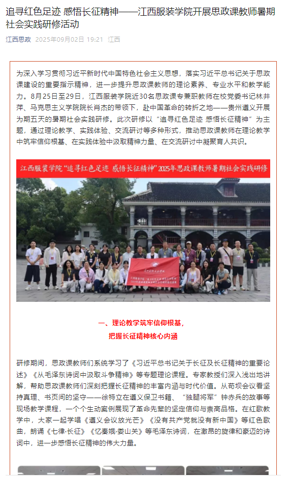 为深入学习贯彻习近平新时代中国特色社会主义思想,落实习近平总书记关于思政课建设的重要指示精神,进一步提升思政课教师的理论素养、专业水平和教学能力。8月25日至29日,江西服装学院近30名思政课专兼职教师在校党委书记林井萍、马克思主义学院院长肖杰的带领下,赴中国革命的转折之地——贵州遵义开展为期五天的暑期社会实践研修。此次研修以“追寻红色足迹 感悟长征精神”为主题,通过理论教学、实践体验、交流研讨等多种形式,推动思政课教师在理论教学中筑牢信仰根基、在实践体验中汲取精神力量、在交流研讨中凝聚育人共识。