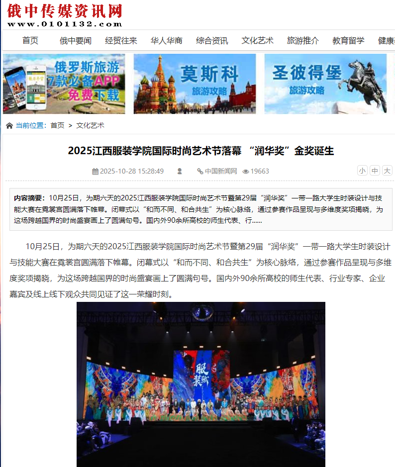 10月25日,为期六天的2025江西服装学院国际时尚艺术节暨第29届“润华奖”一带一路大学生时装设计与技能大赛在霓裳宫圆满落下帷幕。闭幕式以“和而不同、和合共生”为核心脉络,通过参赛作品呈现与多维度奖项揭晓,为这场跨越国界的时尚盛宴画上了圆满句号。国内外90余所高校的师生代表、行业专家、企业嘉宾及线上线下观众共同见证了这一荣耀时刻。