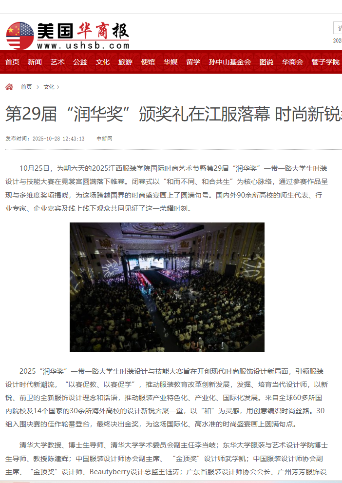 10月25日,为期六天的2025江西服装学院国际时尚艺术节暨第29届“润华奖”一带一路大学生时装设计与技能大赛在霓裳宫圆满落下帷幕。闭幕式以“和而不同、和合共生”为核心脉络,通过参赛作品呈现与多维度奖项揭晓,为这场跨越国界的时尚盛宴画上了圆满句号。国内外90余所高校的师生代表、行业专家、企业嘉宾及线上线下观众共同见证了这一荣耀时刻。