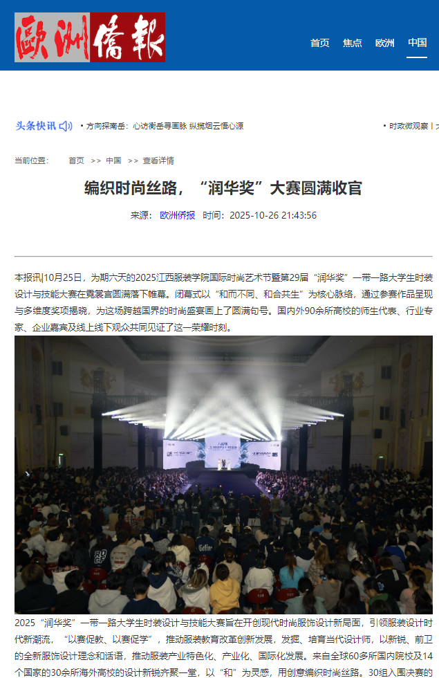 10月25日,为期六天的2025江西服装学院国际时尚艺术节暨第29届“润华奖”一带一路大学生时装设计与技能大赛在霓裳宫圆满落下帷幕。闭幕式以“和而不同、和合共生”为核心脉络,通过参赛作品呈现与多维度奖项揭晓,为这场跨越国界的时尚盛宴画上了圆满句号。国内外90余所高校的师生代表、行业专家、企业嘉宾及线上线下观众共同见证了这一荣耀时刻。