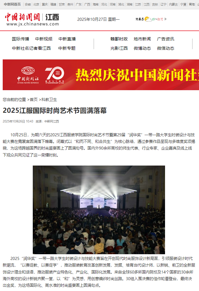 10月25日,为期六天的2025江西服装学院国际时尚艺术节暨第29届“润华奖”一带一路大学生时装设计与技能大赛在霓裳宫圆满落下帷幕。闭幕式以“和而不同、和合共生”为核心脉络,通过参赛作品呈现与多维度奖项揭晓,为这场跨越国界的时尚盛宴画上了圆满句号。国内外90余所高校的师生代表、行业专家、企业嘉宾及线上线下观众共同见证了这一荣耀时刻。