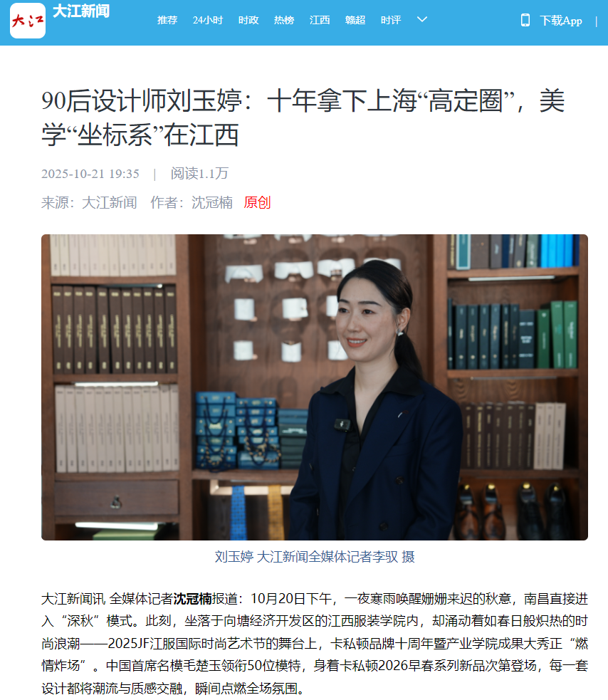 10月20日下午,一夜寒雨唤醒姗姗来迟的秋意,南昌直接进入“深秋”模式。此刻,坐落于向塘经济开发区的江西服装学院内,却涌动着如春日般炽热的时尚浪潮——2025JF江服国际时尚艺术节的舞台上,卡私顿品牌十周年暨产业学院成果大秀正“燃情炸场”。中国首席名模毛楚玉领衔50位模特,身着卡私顿2026早春系列新品次第登场,每一套设计都将潮流与质感交融,瞬间点燃全场氛围。