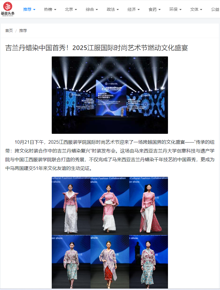10月21日下午,2025江西服装学院国际时尚艺术节迎来了一场跨越国界的文化盛宴——“传承的纽带:跨文化时装合作中的吉兰丹蜡染复兴”时装发布会。这场由马来西亚吉兰丹大学创意科技与遗产学院与中国江西服装学院联合打造的秀展,不仅完成了马来西亚吉兰丹蜡染千年技艺的中国首秀,更成为中马两国建交51年来文化友谊的生动见证。