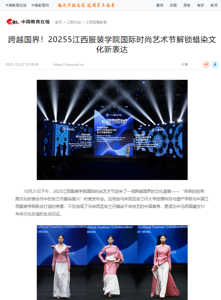 10月21日下午,2025江西服装学院国际时尚艺术节迎来了一场跨越国界的文化盛宴——“传承的纽带:跨文化时装合作中的吉兰丹蜡染复兴”时装发布会。这场由马来西亚吉兰丹大学创意科技与遗产学院与中国江西服装学院联合打造的秀展,不仅完成了马来西亚吉兰丹蜡染千年技艺的中国首秀,更成为中马两国建交51年来文化友谊的生动见证。